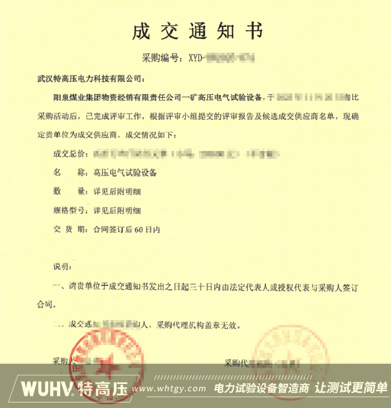 近日,武汉特高压正式收到《成交通知书》,确认中标阳泉煤业集团物资经销有限责任公司一矿高压电气试验设备采购项目。这一成果的背后,是武汉特高压团队对客户需求的精准把握、对投标流程的严谨执行以及对服务质量的不懈追求。