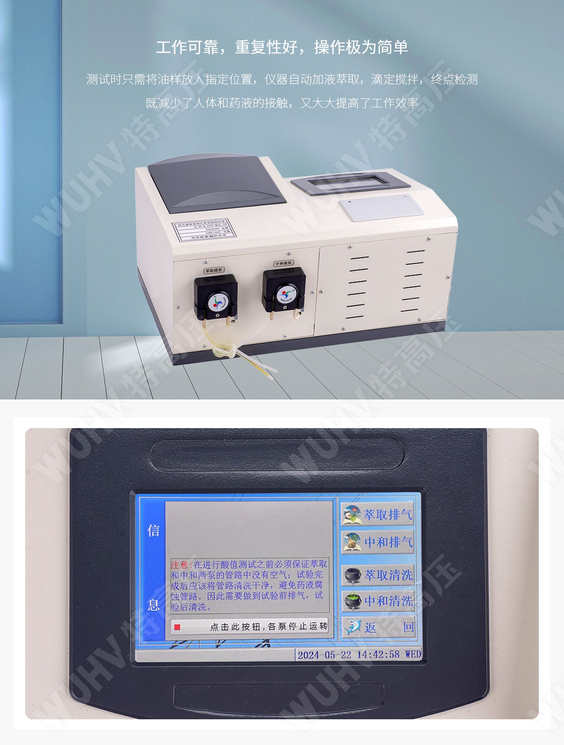 变压器和汽轮机油酸值的检测是电力系统及工矿企业充油电气设备的常规检验项目,而UHV-665 全自动酸值测定仪是我公司针对上述油品酸值测定而开发的专用设备。该仪器以单片微电脑为核心,集光、机、电和化学等多学科技术之大成。基本完全替代了手工操作,即提高了工作效率,又减轻了操作人员的劳动强度,最大限度地减少了有机溶剂等化学药品对人体的危害。